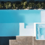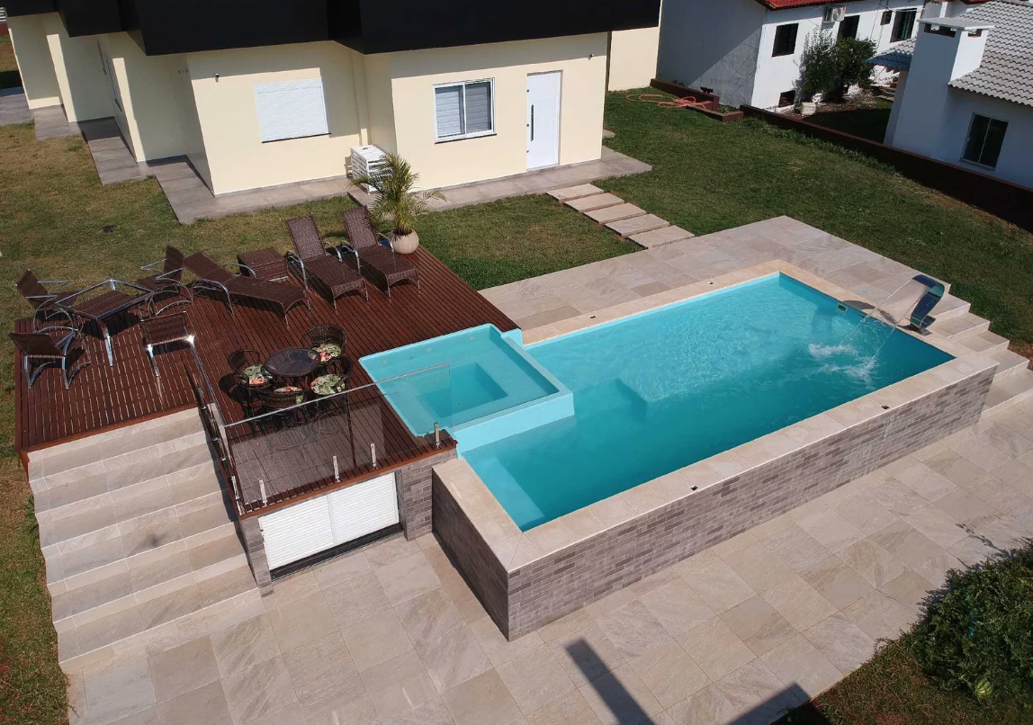An innovative line featuring an elevated spa, overflowing into the pool with an infinity edge effect.